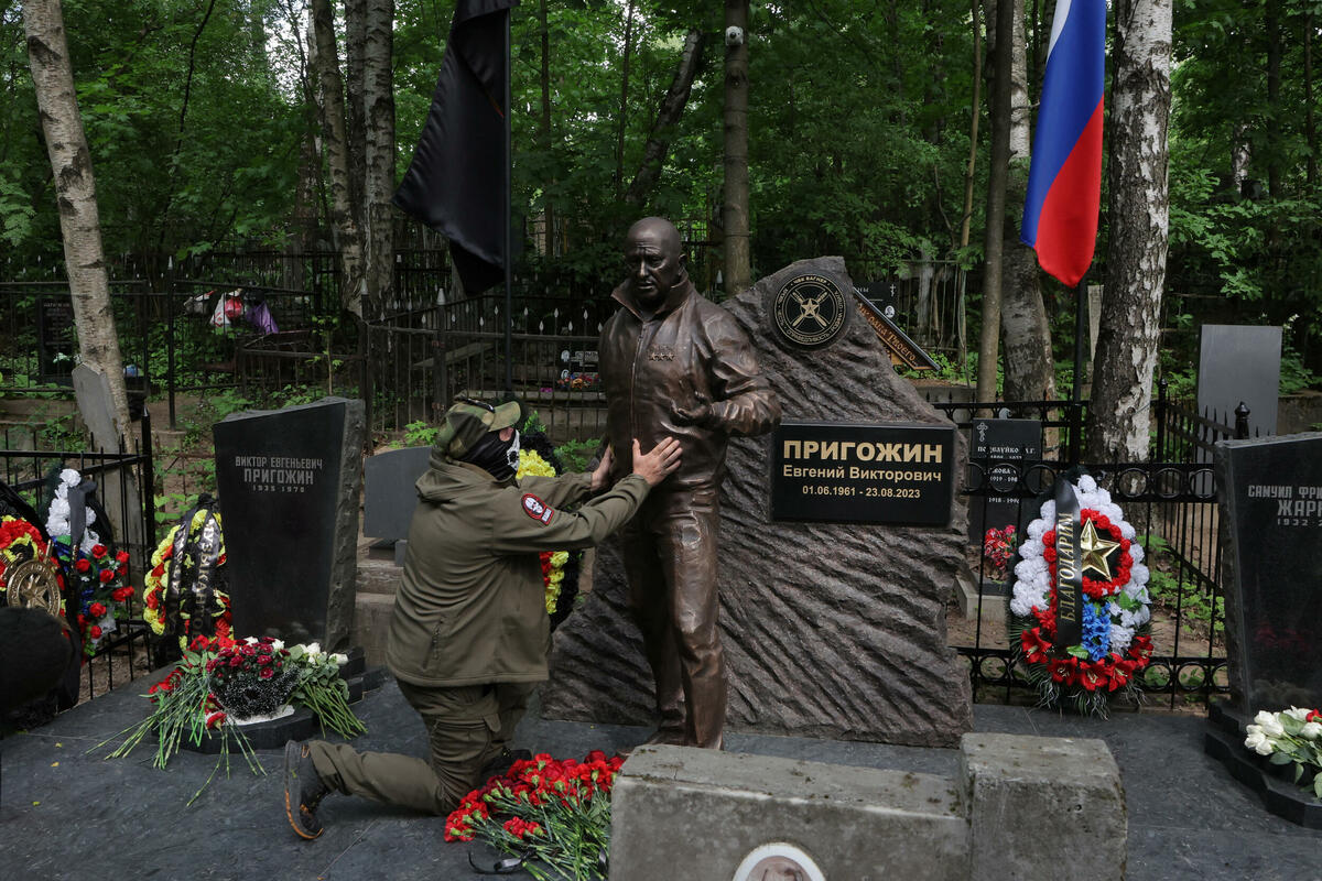 Bronzana statua bivšeg vođe ruske paravojne grupe Vagner, Jevgenija Prigožina, koji je poginuo u avionskoj nesreći u avgustu 2023, postavljena je danas pored njegovog groba u Sankt Peterburgu.