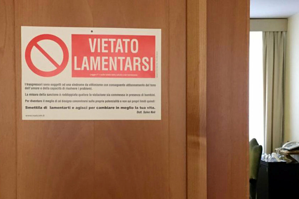 Na natpisu pored riječi "Zabranjeno kukanje" sitnijim slovima piše: "Oni koji se toga ne pridržavaju podležu sindromu viktimizacije sa značajno smanjenim nivoom dobrog raspoloženja i sposobnosti za rješavanje problema".
