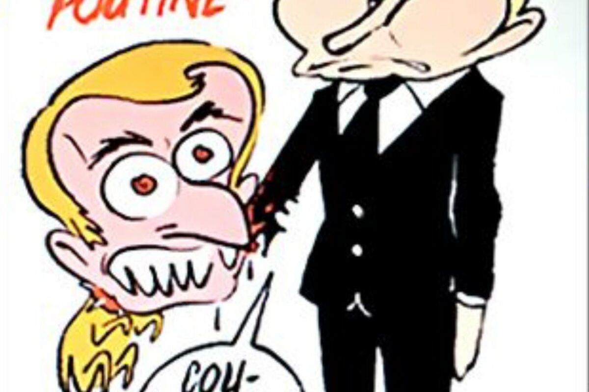 Na karakaturi, Putin je prikazan, u formalnom izdanju, dok ga za ruku grize štene, sa glavom Makrona.