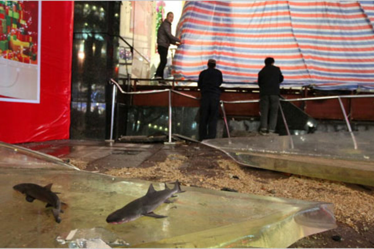 Petnaest osoba je lakše povrijeđeno nakon što je u trgovačkom centru Orijent u Šangaju u Kini pukao akvarijum od 33,5 tona, u kojem su se nalazile ajkule.