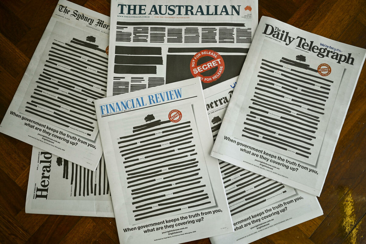 Naslovne strane najvećih dnevnih listova u Australiji pune su stubaca redigovanog teksta, čime su izdavači htjeli da pokažu jedinstvo u borbi za slobodu medija i protiv državnog cenzurisanja.