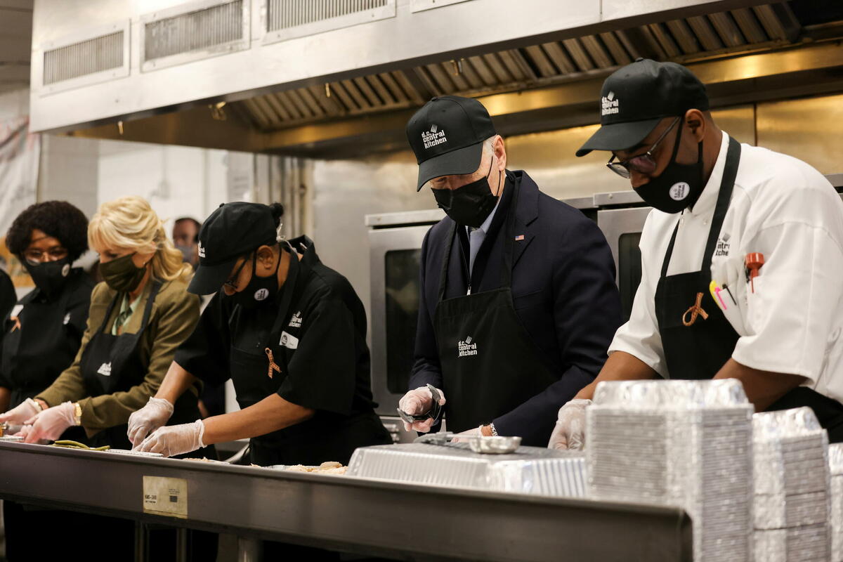 Predsjednik SAD Džozef Bajden i njegova supruga Džil pakovali su obroke sa ćuretinom i slatkim krompirom u Centralnoj kuhinji D.C, organizaciji koja pravi hranu za škole i skloništa za beskućnike u Vašingtonu, uoči ovonedeljnog praznika Dan zahvalnosti.
