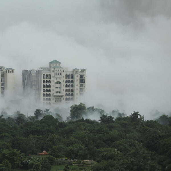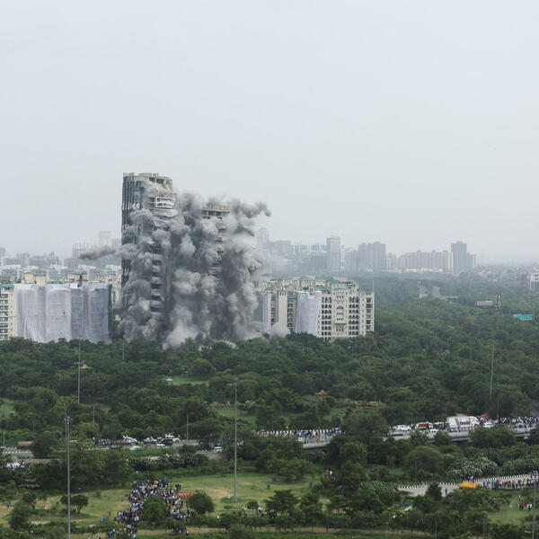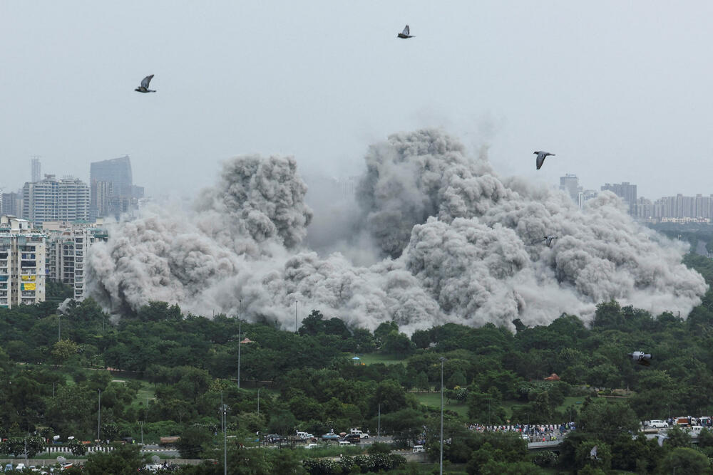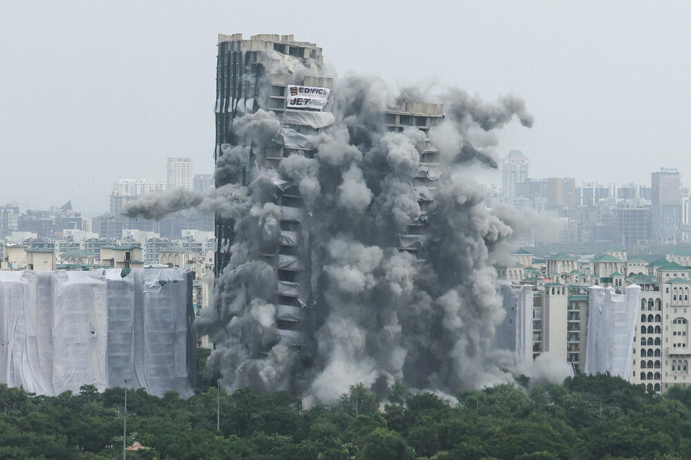 U blizini Delhija u Indiji izvršena je kontrolisana eksplozija pri čemu su srušena dva nebodera visine 103 metra, a rušenje je prenošeno direktno na televiziji. Dva nebodera od 30 spratova srušena su po nalogu Vrhovnog suda jer su prekršena pravila izgradnje tornjeva, prenosi agencija Rojters.