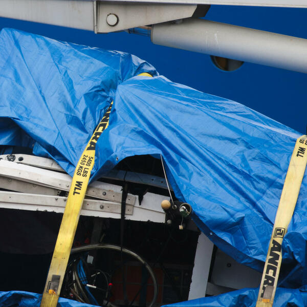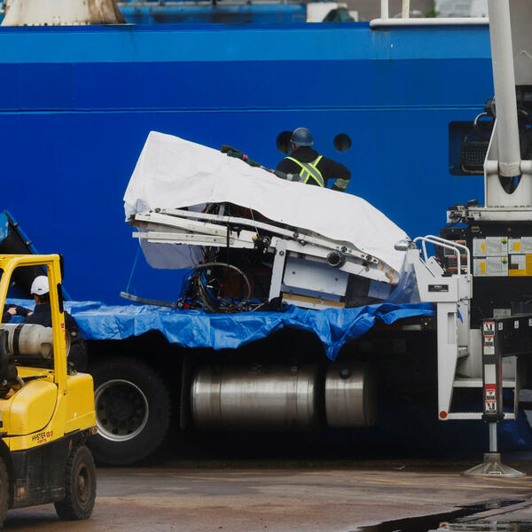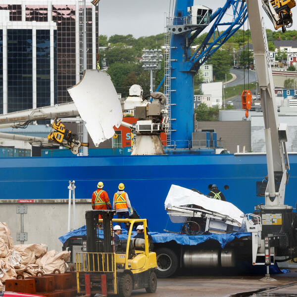 Na snimku Kanadske radiodifuzne korporacije vidi se nešto što izgleda kao nos podmornice i drugi razbijeni fragmenti umotani u bijelu ceradu koje je dizalica povukla sa broda Horizon Arctic u luci Sent Džon u Njufaundlendu jutros.