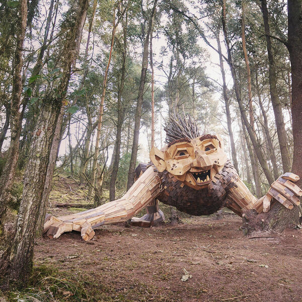 Danski umjetnik reciklaže Tomas Dambo i njegov tim su od drvenih paleta, starog namještaja, buradi za vino i drugog odbačenog materijala izgradili čak 170 skulptura u duhu nordijskih mitskih usamljenika, džinovskih trolova nepovjerljivih prema ljudima.