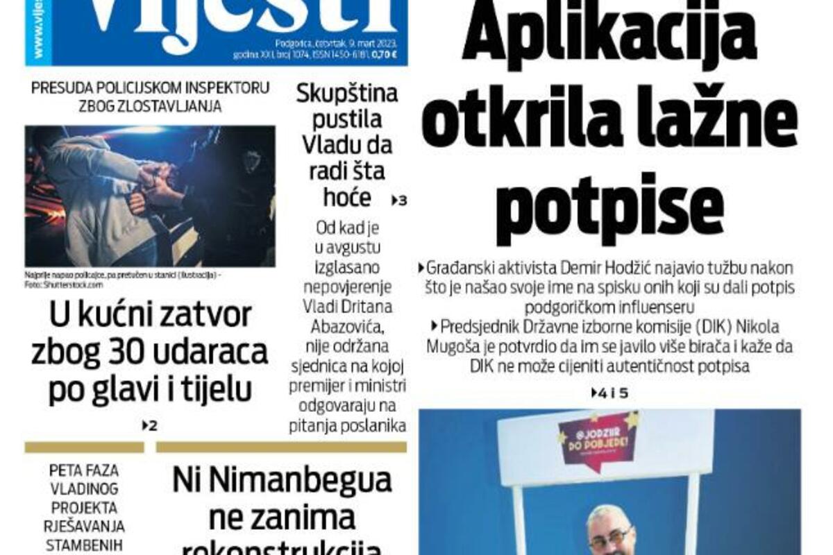 Naslovna strana "Vijesti" za 9. mart 2023.