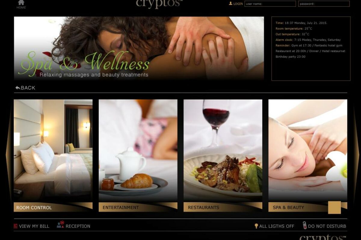 Cryptos je rješenje za hotele, rezidencijalne komplekse i marine, platforma koja kroz integraciju sistema povećava efikasnost poslovanja na svim nivoima. Cryptos stavlja poseban akcenat na obezbjeđivanje punog komfora klijentu kao korisniku i interakciju sa hotelskim gostom. Ova platforma Vam nudi opciju da sa jednog uređaja kontrolišete sve ono što Vam je potrebno, bilo da ste u šetnji, u kući ili u hotelu. Gdje god da se nalazite u mogućnosti ste da koristite multimedijalne sadržaje, komunicirate sa ličnim asistentom i dobijete informacije kao i bilo koju vrstu podrške. Sve ono što Vam treba tokom jednog dana spaja se u Cryptosu zbog čega djeluje kao da ste se našli u nekom naučno fantastičnom filmu. Cryptos pruža osjećaj većeg komfora i luksuza kroz mogućnost korišćenja velikog broja servisa a dostupan je na različitim platformama: touch panelu, hotelskom TV-u, smart telefonu, tabletu, notebook-u, PC-ju i može se prilagoditi željama korisnika kako dizajnom, tako i funkcijama.