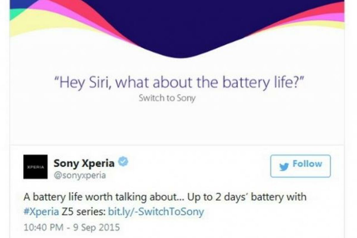 Sony je tvitovao fotografiju, sličnu onoj koju je Apple prošlog mjeseca poslao kao pozivnice za iPhone 6s događaj. Kao što možete vidjeti, Sony "pita" Siri o trajanju baterije novih telefona a sve prati tekst " Switch to Sony".