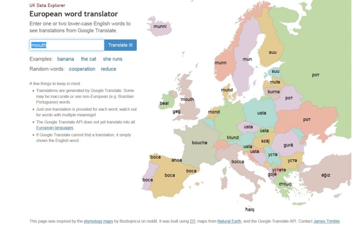 Na stranici UK Data Explorer možete naći velik broj interaktivnih mapa na kojima su prikazani najrazličitiji podaci. Jedan od posljednjih projekata je mapa Evrope na kojoj možete vidjeti kako se u različitim zemljama kaže riječ za koju postavite upit.