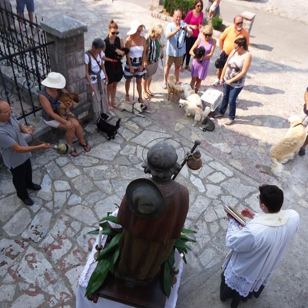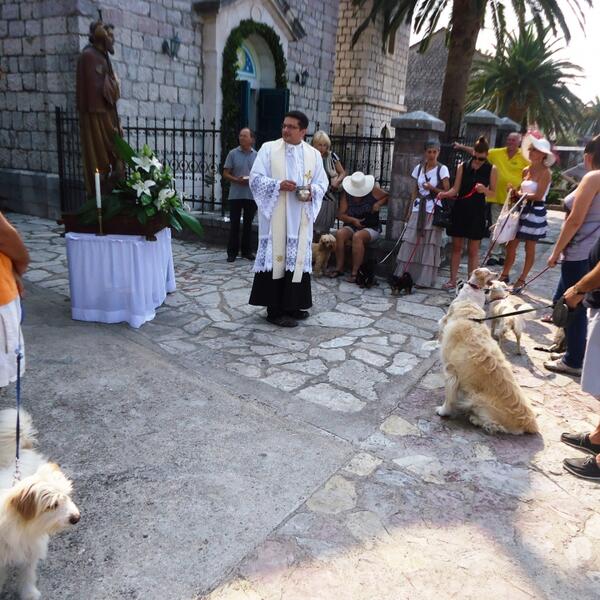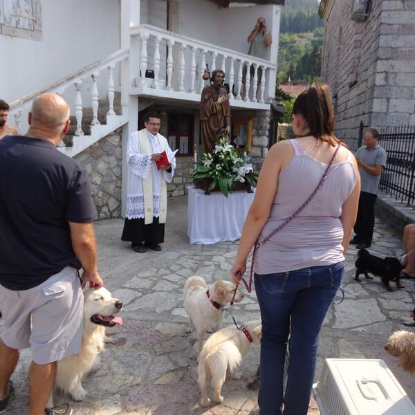 Naslovna Vijesti Blagoslov kućnih ljubimaca u Tivtu Vlasnici kućnih ljubimaca i turisti okupili su se juče pred župnom crkvom Svetog Roka u Donjoj Lastvi kod Tivta, učestvujući u neuobičajenom vjerskom obredu – blagoslovu kućnih ljubimaca koji je obavio lastovski župnik don Dejan Turza. 90 pregleda 8 komentar(a) Siniša Luković 16.08.2013. 10:55h Ažurirano: 16.08.2013. 10:55h Galerija 1 / 6 Foto: Siniša Luković Bonus video: Vijesti kućni ljubimcipsiTivat