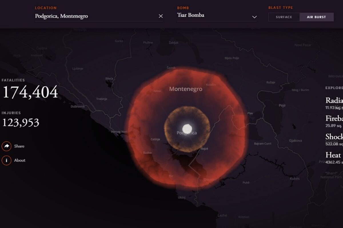 Bačena na Podgoricu, nuklearna bomba ubila bi više 174,404 ljudi, 123,953 ljudi bi bilo povrijeđeno, pokazuje nova interaktivna mapa.