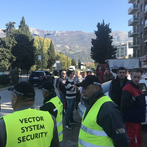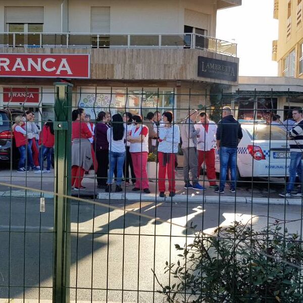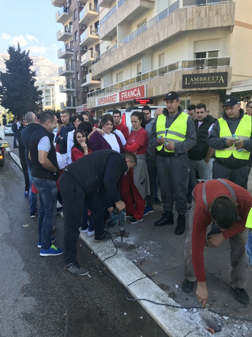 Radnici supermarket "Franca" u Budvi izašli su danas na ulicu kako bi spriječili postavljanje stubića na trotoaru ispred prodavnice na glavnoj gradskoj raskrsnici.