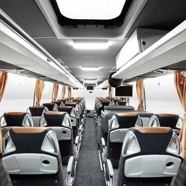 Široka paleta različitih dezena patosa, razne ocije presvlaka sjedišta zavjesa, i zone plafona, omogućavaju opremanje autobusa po želji kupca.
