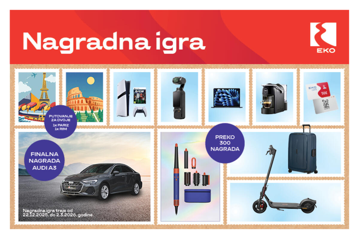 Jugopetrol AD nastavlja uspješnu nagradnu igru „EKO Vozi i Osvoji“. Od 22. decembra do 2. marta 2026. godine, svaka posjeta EKO stanici je korak bliže ka vrijednim nagradama. Kao kruna nagradne igre i dodatni znak zahvalnosti na povjerenju, u završnom izvlačenju biće poklonjen automobil Audi A3 Limousine 35 TFSI S-tronic.