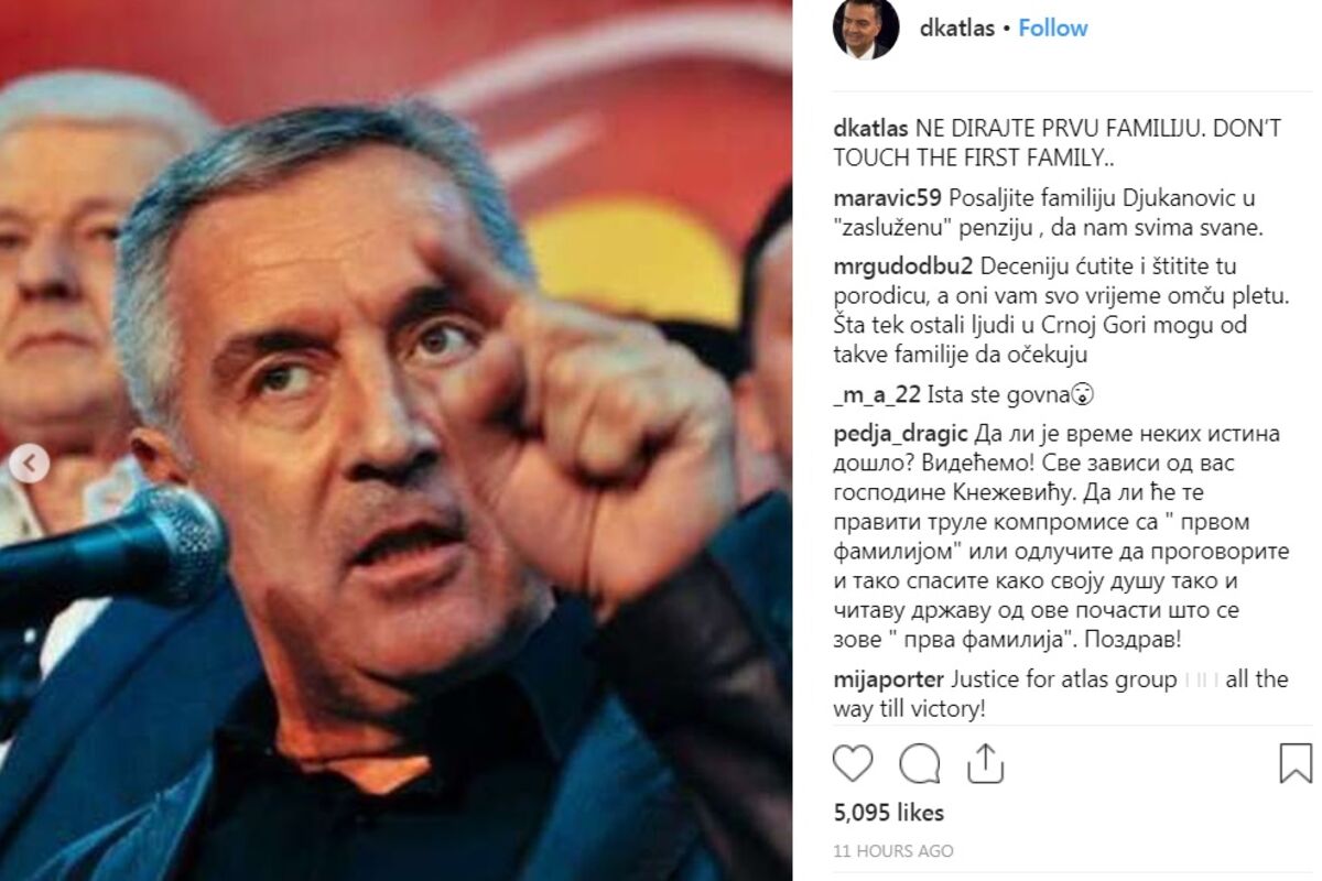 Takođe objavljen je logo Prve banke, fotografija Aca Đukanovića, fotografija na kojoj su predsjednik Crne Gore Milo Đukanović i Knežević, zatim premijer Duško Marković ispod čije fotografije piše "Ne dirajte prvu familiju".
