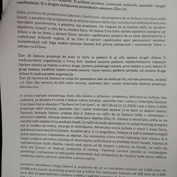 "Dana 7. i 8. avusta za sada nepoznata lica izvršila su nezakonito postavljanje zastave Crne Gore na mjesto i način protivno Zakonu o državnim simbolima i Danu državnosti Crne Gore i protivno pravilniku o bližem načinu isticanja, upotrebe, kao i sastavu materijala Zastave Crne Gore, na način što su na kovanu ogradu Cetinjskog manastira, na kovanu ogradu Vlaške kao i na zvoniku Bajičke crkve, kao kulturnih dobara i vjerskih objekata, improvizovanim vezivnim sredstvom pričvrstili više zastava Crne Gore i na taj način istu upotrijebili u prilici, na mjestu i na način protivan naprijed navedenim imperativnim propisima i na taj način umanjili, degradirali i zloupotrijebili državnu zastavu kao najvažniji državni simbol i reprezent Crne Gore", kazao je pravni zastupnik Mitropolije crnogorsko primorske, advokat Kavarić.