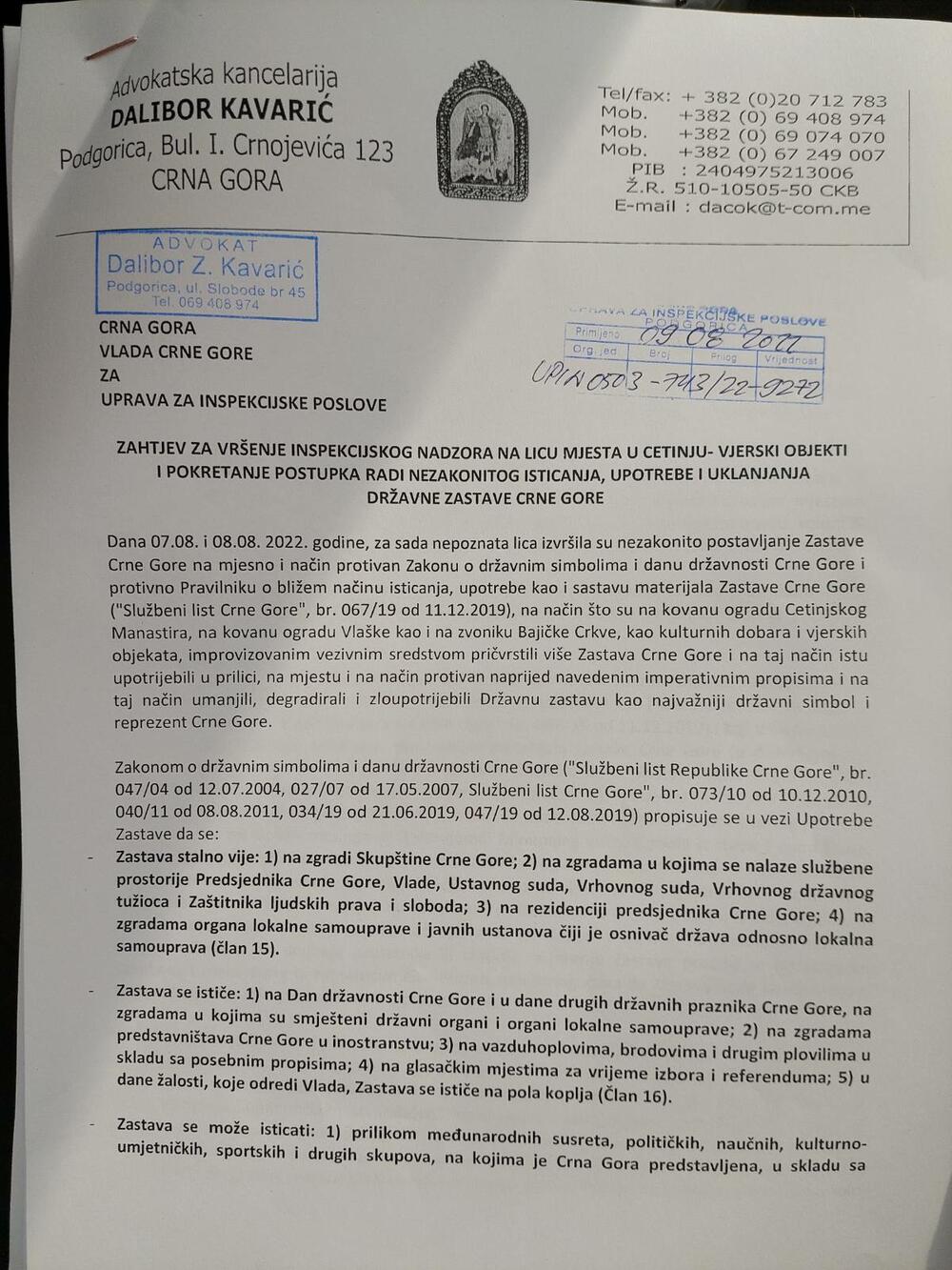 Advokat Dalibor Kavarić podnio je zahtjev Upravi za inspekcijske poslove da obavi inspekcijski nadzor na Cetinju i pokrene postupak zbog, kako navodi nezakonitog isticanja, upotrebe i uklanjanja državne zastave.