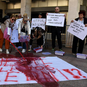 Oni su polili crvenu boju, koja simboliše crnogorsku krv po transparentu na kojem piše: “Jeste li još žedni”.