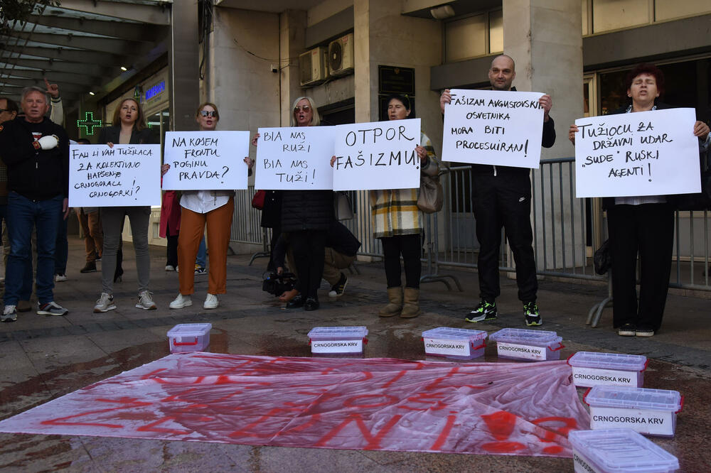 Na istom fonu bili su i učesnici jučerašnjeg protesta, tokom kog su nosili transparente: “Tužiocu za državni udar ‘sude’ ruski agenti”, “Fašizam avgustovskih osvetnika mora biti procesuiran”, “Otpor fašizmu”, “BIA nas ruži, BIA nas tuži”, “Pravo na život je neotuđivo”, “Novoviću, fali li glava za ‘ruski safari’”...