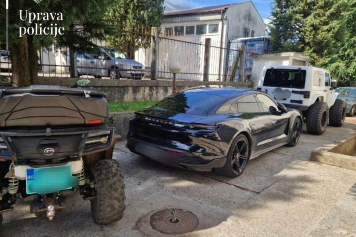 "Policijski službenici su, shodno pribavljenim naredbama suda, izvršili pretrese stanova i pomoćnih objekata koje na dvije lokacije koristi V.J. (39). Pretresom kuće u mjestu Kosić, policijski službenici Odjeljenja bezbjednosti Danilovgrad su privremeno, radi daljih provjera, oduzeli vozila Porsche Taycan beranskih registarskih oznaka, Audi A3 podgoričkih registarskih oznaka, Fiat Doblo tivatskih registarskih oznaka, Jeep Wrangler američkih registarskih oznaka i kvad CTF podgoričkih registarskih oznaka", saopšteno je iz policije.