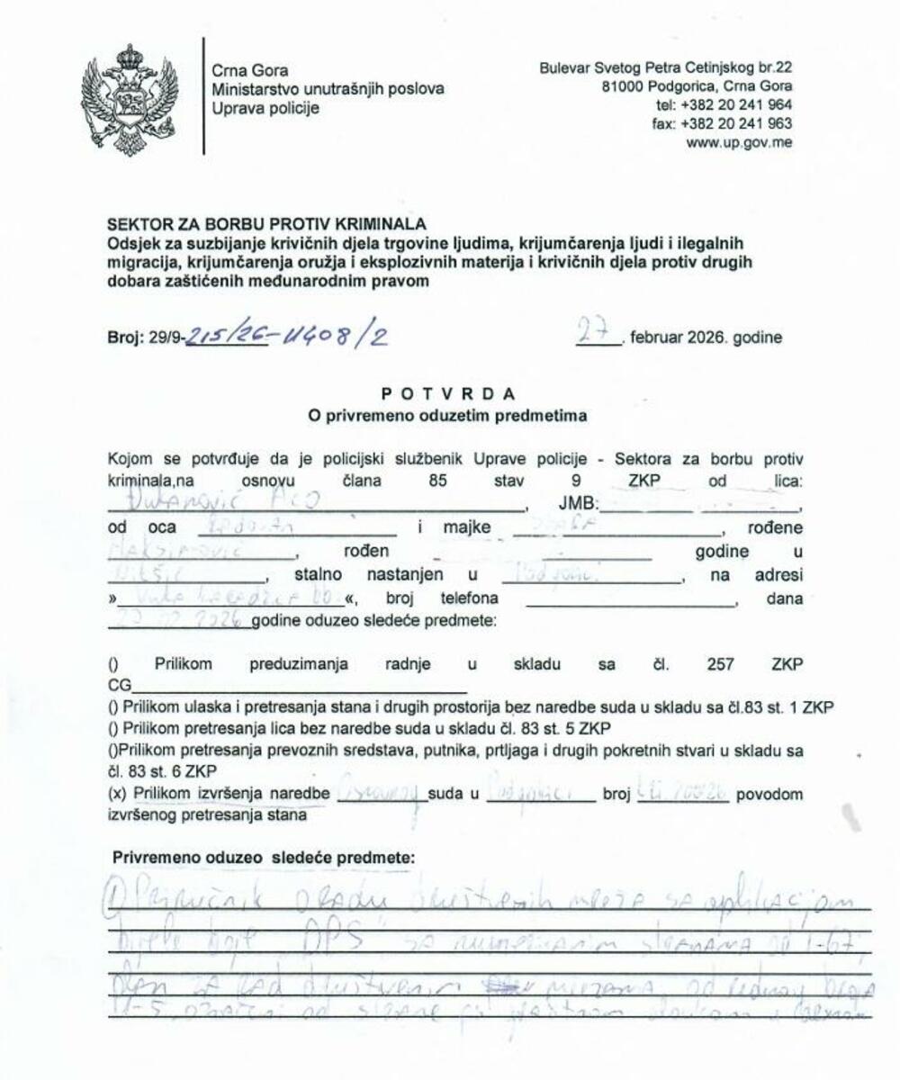 Dodaje se da je naredbom sudije za istragu Osnovnog suda u Podgorici Rada Ćetkovića, koja je donijeta na zahtjev policije, izvršen pretres stana Aca Đukanovića u Ulici Vuka Karadžića, u Podgorici.