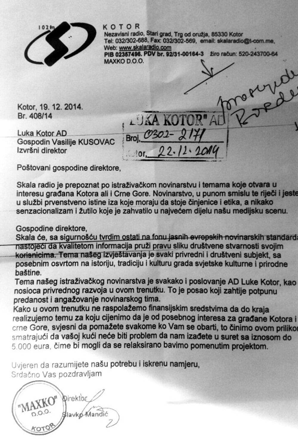 „Vijesti“ su međutim, došle do dokumenta iz kojeg se može naslutiti sa kakvih pozicija nastupa Mandić - njegovo obraćanje izvršnom direktoru “Luke Kotor” od 19. decembra prošle godine, u kome Mandić traži da mu se „izađe u susret sa iznosom do 5.000 eura, čime bi mogli da se relaksirano bave pisanjem o poslovanju Luke Kotor koje je tema našeg istraživačkog novinarstva... i posao koji zahtijeva potpunu predanost i angažovanje novinarskog tima“.