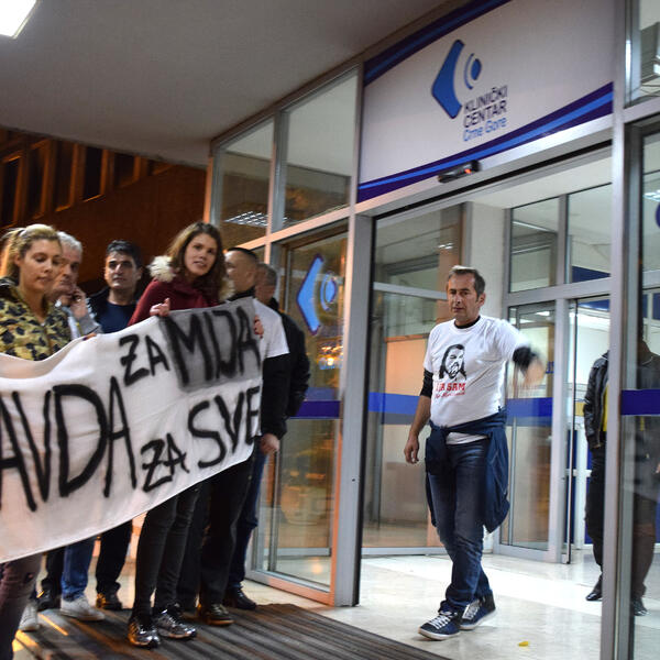 Cetinjanin Miodrag Mijo Martinović, koga su pripadnici Specijalne terorističke jedinice (SAJ) brutano pretukli nakon protesta Demokratskog fronta 24. oktobra, obratio se građanima koji su se večeras u znak podrške Martinoviću okupili ispred KCCG.