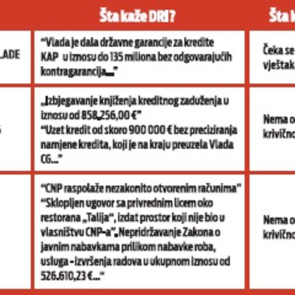 Tužilaštvo je procijenilo da nema osnova za pokretanje krivičnog postupka, uprkos negativnim izvještajima DRI za Univerzitet Crne Gore, Radioteleviziju Crne Gore, Crnogorsko narodno pozorište, Centar za stručno obrazovanje i Centar savremene umjetnosti.