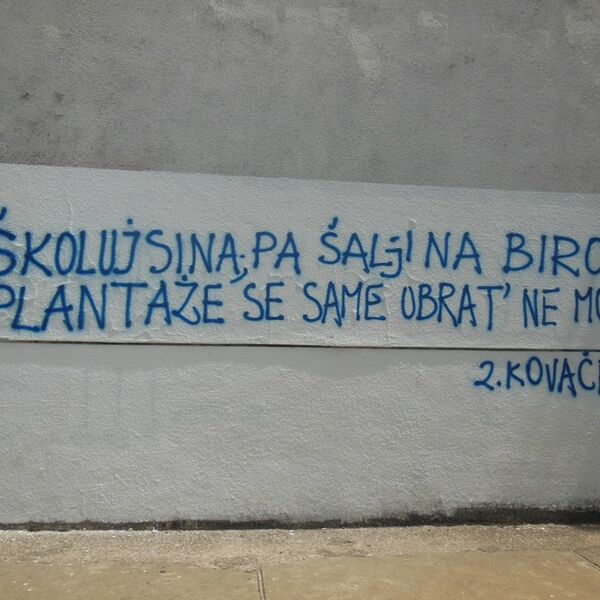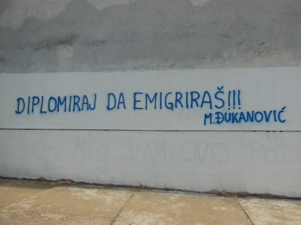 Na zgradi Filozofskog fakulteta u Nikšiću osvanuli su natpisi "Diplomiraj da emigriraš", u potpisu M. Đukanović, i "Školuj sina pa šalji na Biro, Plantaže se same obrat' ne mogu", Z. Kovačević.