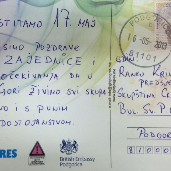"Prva crnogorska LGBT razglednica, sa motivima Podgorice, promovisana je 2013. godine, povodom obilježavanja 17. maja - Međunarodnog dana borbe protiv homofobije i transfobije. Prva LGBT razglednica, ispred LGBT zajednice, adresirana je i poslata predsjedniku Skupštine Crne Gore gospodinu Ranku Krivokapiću. Druga LGBT razglednica promovisana je uoči organizovanja prvog crnogorskog Prajda u Budvi, jula 2013. godine", podsjetili su iz LGBT Foruma Progres.