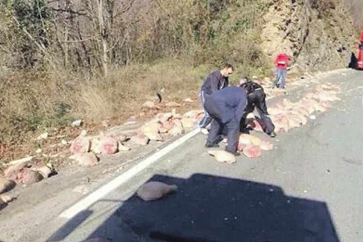 Na fotografiji objavljenoj juče na društvenim mrežama vidi se da na desetine svinjskih butova na magistrali, koje nekoliko osoba kupe po putu. Autor fotografije tvrdi da su potom pršute ponovo utovarene.