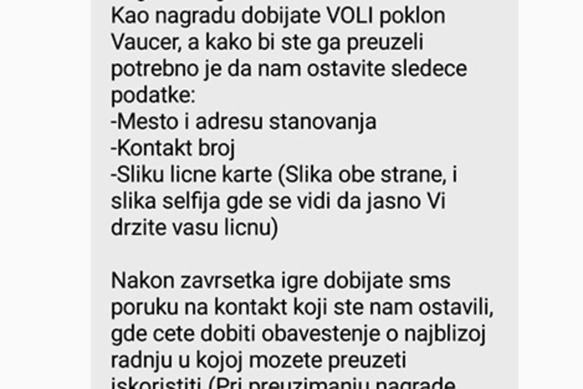 “Kao nagradu dobijate VOLI poklon Vaučer, a kako bi ste ga preuzeli potrebno je da nam ostavite sledeće podatke: mjesto i adresu stanovanja, kontakt broj, sliku lične karte (slika obe strane, i slika selfija gde se vidi da jasno Vi držite vašu ličnu)”, navodi se u poruci. Nakon toga će “srećni” dobitnici, navodno dobiti poruku o najbližoj radnji u kojoj bi iskoristili vaučere.