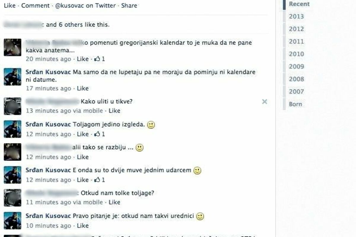 “Urednicima dnevnika u Crnoj Gori i Srbiji uliti u tikve da sutra ne slave Božić katolici, nego većina hrišćana i čak većina pravoslavnih crkava”, napisao je on na svom nalogu na Tviteru i Fejsbuku. Na pitanje jednog od sljedbenika “kako uliti u tikve”, on odgovara ”toljagom izgleda”, a zatim dodaje “smajli”.