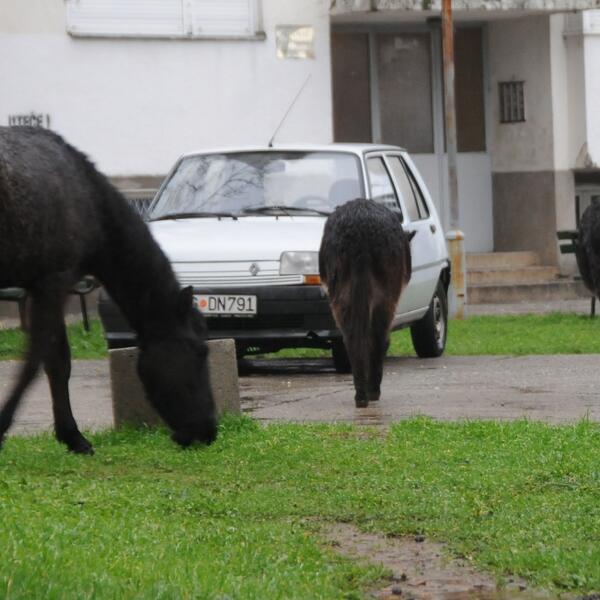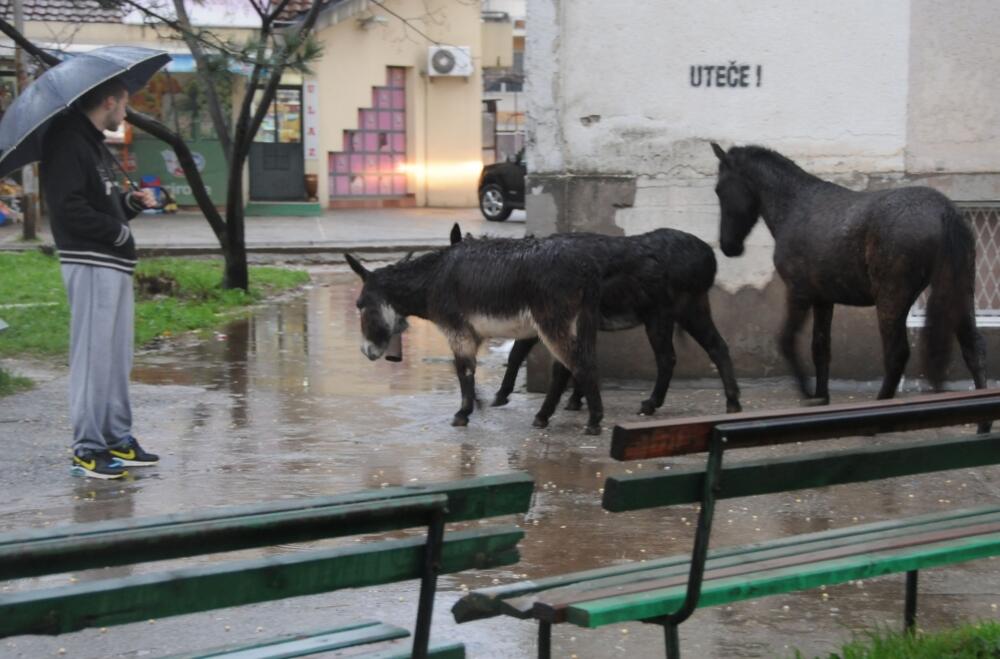 Konj i dva magarca mirno su juče pasli u Momišićima ispred prvog solitera, a “uznemiravali” su ih samo pojedini prolaznici koji su, uprkos kiši, zastajali da ih slikaju.