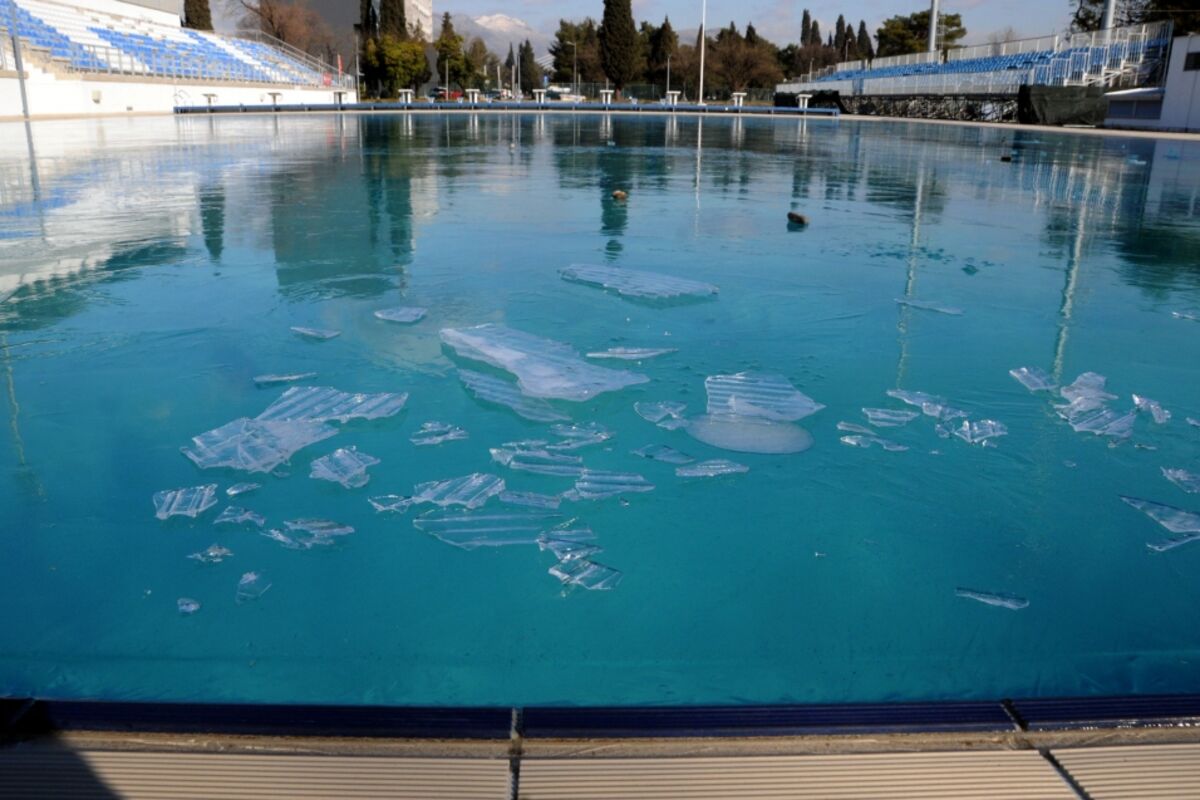 Voda u dva gradska bazena kod Sporstkog centra “Morača” zaledila se tokom predhodne noći, i pogotovo na površini manjeg, formirao se debeo sloj leda.