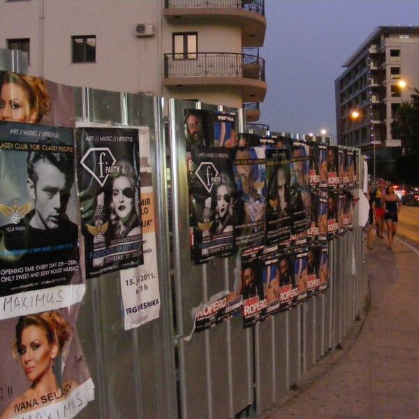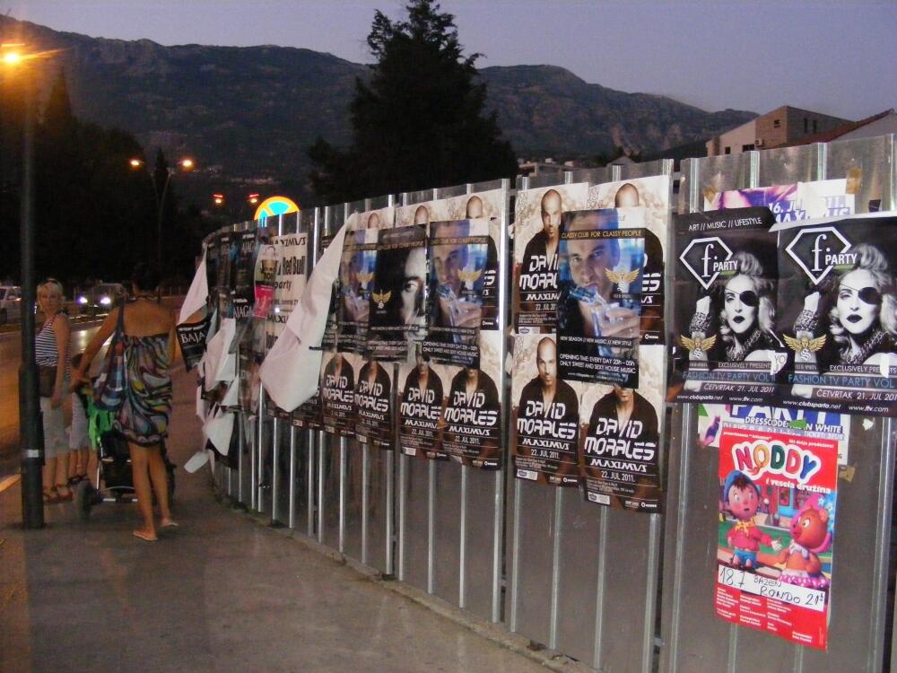 Nalik prizorima iz najagresivnijh predizbornih kampanja od prije deset godina, kada je Budva bila bukvalno prekrivena plakatima političkih lidera i stranaka, ove sezone na sceni je svojevrsni reklami rat ugostitelja koji su sve slobodne javne površine, od zidova zgrada, ograda, stubova za rasvjetu, saobraćajnih znakova, pa do drveća, oblijepili posterima “zvijezda” koje gostuju u njihovim lokalima.