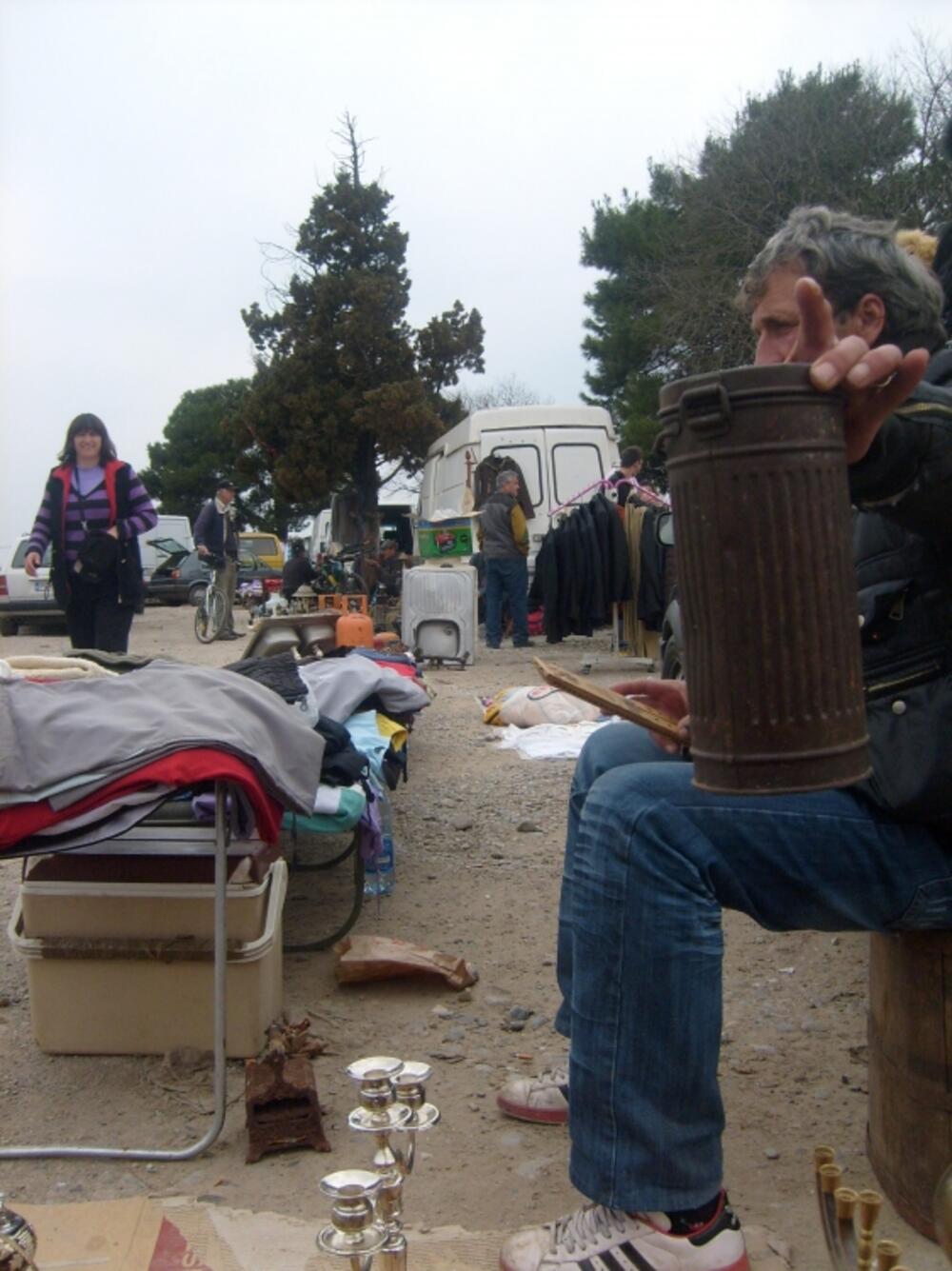 Kolega preko puta pokazuje metalnu rebrastu kutiju u obliku valjka, koju su nosili njemački vojnici u Drugom svjetskom ratu, a dobro očuvani ratni rekvizit cijeni 20 eura. Brojni su trgovci vojnom opremom iz novijeg perioda. Pohabane i iznošene vojničke cokule su 10 eura, maska tri, blijedo-sivomaslinaste bokserice 0,50 eura, opasači, stare cipele, i patike... krofne na tacni, gužva oko mesa na roštilju, kuvar u bijelom odijelu... i glas dječaka, koji odzvanja buvljakom: „ najbrži način... pogledajte gospodo...“.