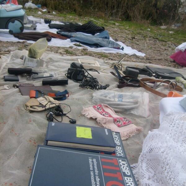 Zarđali alat, pijuci, krst sa raspećem, rokovnik iz 2004. godine, faks aparat od šest eura, digitalni fotoaparati, bijele futrole za pištolj... , mlin za kafu je pet, časovnici na navijanje četiri eura, opanci, dječje igračke, posuđe, daljinski... kuhinjski elementi za 10-20 eura, fotelje od 15 eura, novčanica od 20 dinara iz SFRJ za 0,50 eura, mesingani svijećnjaci i diktafon sa kasetom na kojem je naljepnica jedne novinske kuće, komponente i tastature za kompjuter, bunde sa olinjalom dlakom „iz Njemačke“, satovi „cartie“, „breiling“, koji zaista izgledaju kao originali, i cijene se 50 eura, a između svega - dva šljema iz Prvog svetskog rata.