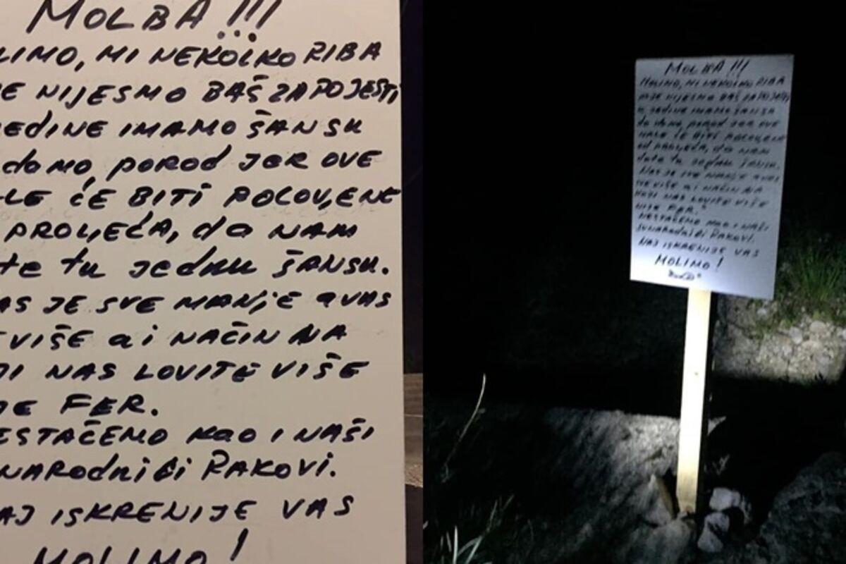 “Molimo, mi nekolike ribe koje nijesmo baš za pojesti, a jedine imamo šansu da damo porod, jer ove male će biti polovljene od proljeća, da nam date tu jednu šansu. Nas je sve manje, a vas sve više, a i način na koji nas lovite više nije fer. Nestaćemo kao i naši sunarodnici rakovi. Najiskrenije vas molimo“, piše na tabli.