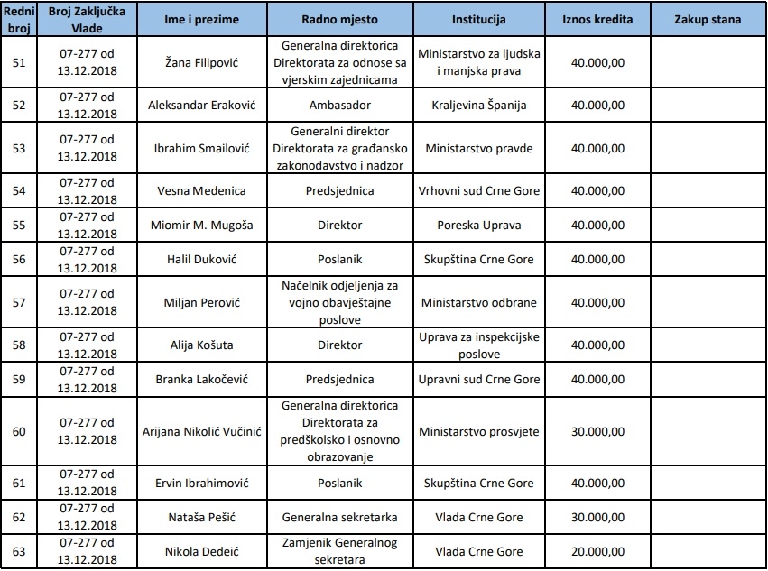 Među 96 funkcionera koji su bili “srećne ruke” su i čelnici ili predstavnici ključnih institucija u oblasti vladavine prava - predsjednik Ustavnog suda Dragoljub Drašković, predsjednica Vrhovnog suda Vesna Medenica, predsjednica Upravnog suda Branka Lakočević, predsjednik Višeg suda za prekršaje u Podgorici Milivoje Rašović, specijalni tužioci Lidija Vukčević i Saša Čađenović, direktor Agencije za sprečavanje korupcije Sreten Radonjić.., ali i mnogi poslanici, ministri i njihovi pomoćnici, ambasadori, direktori uprava, odnosno oni sa visokim primanjima kojima je poklonjeno 80 odsto vrijednosti kredita.