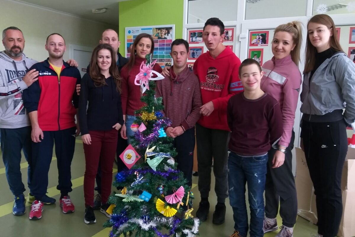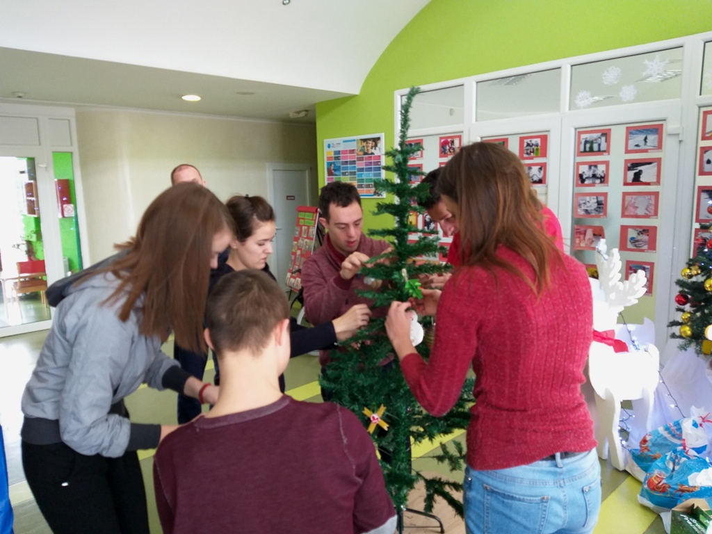 Volonteri „Alfa centra“ i korisnici Dnevnog centra za djecu sa smetnjama u razvoju i osobe sa invaliditetom iz Nikšića kitili su jelku koju su dobili na poklon od volontera, zajedno sa ukrasima koje su napravili tokom kreativne radionice.