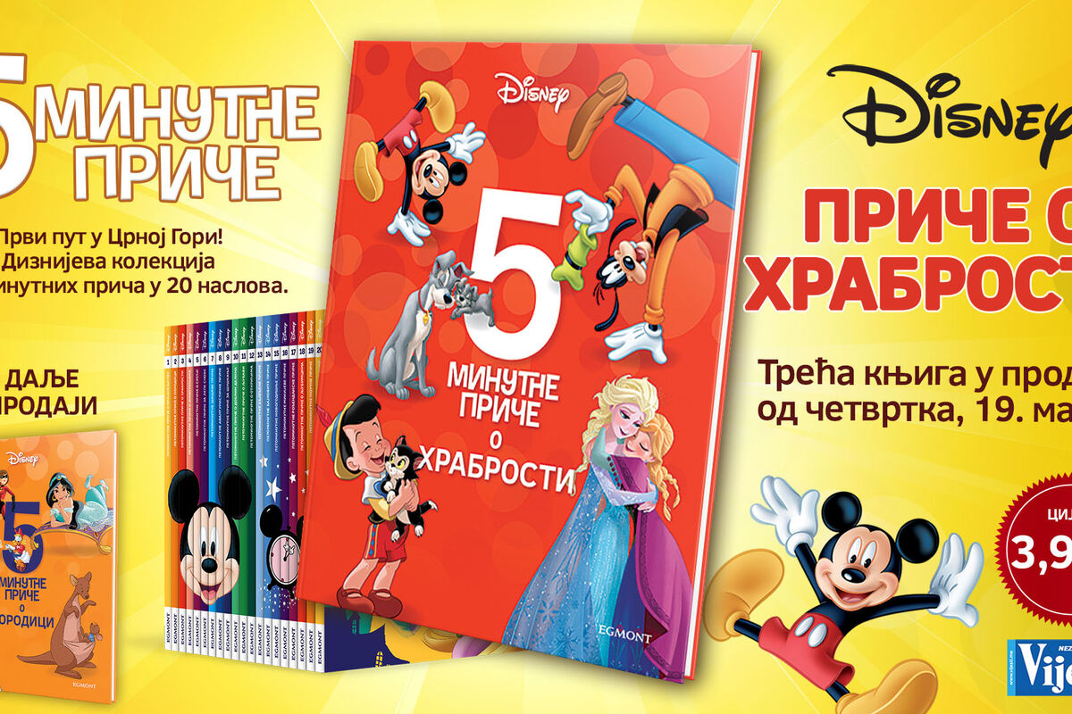 Treća knjiga „Petominutne priče o hrabrosti” u prodaji je od četvrtka, 19. marta i sadrži priče o Mikiju Mausu i njegovoj družini, sestrama Ani i Elsi iz Zaleđenog kraljevstva, drvenom lutku Pinokiju i Švrći iz priče "Maza i Lunja". Ovi Diznijevi junaci ispričaće priče o hrabrosti, koje mogu biti inspiracija za razgovor o dječjim strahovima, njihovoj odvažnosti ili plašljivosti. Isto tako, ove priče su izvanredan način da uljepšate i obogatite vrijeme provedeno sa vašom djecom, unucima, rođacima…
