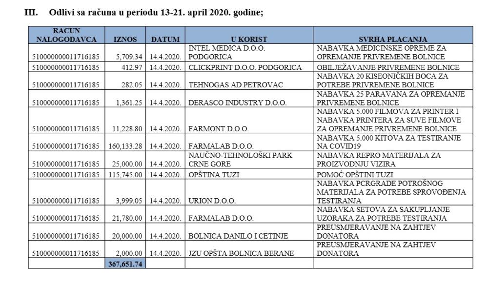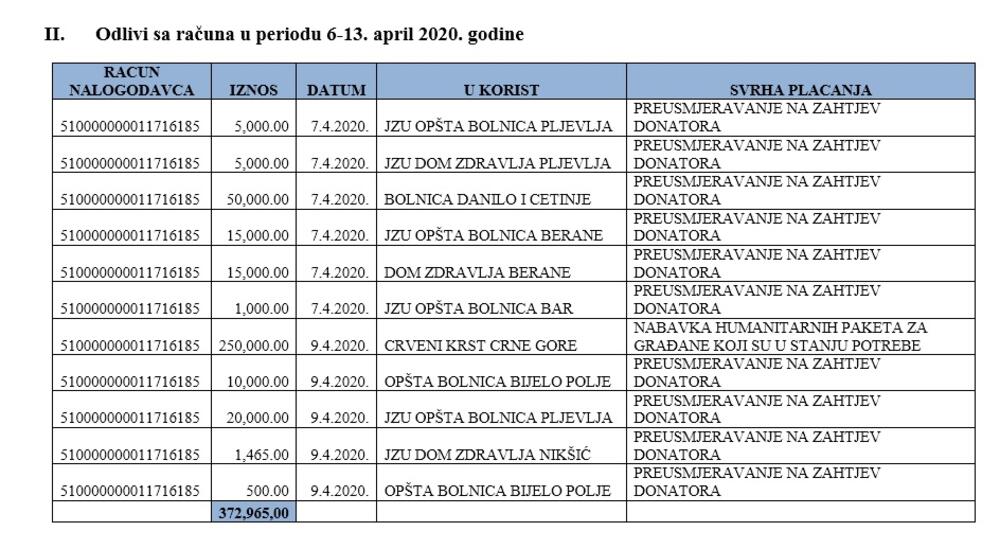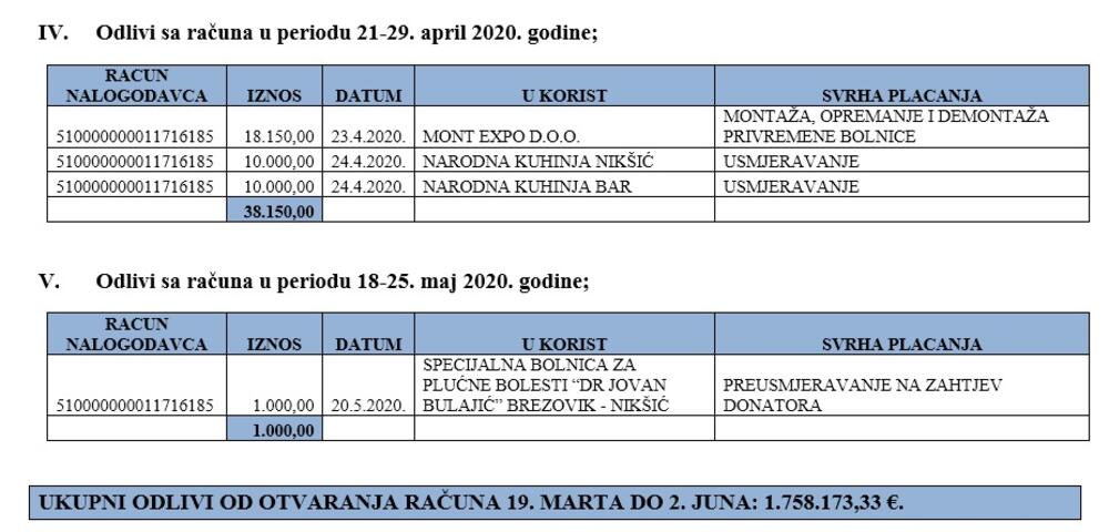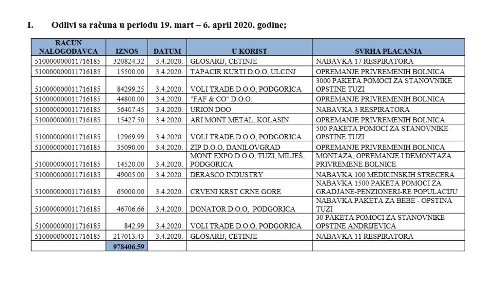 "U skladu sa procjenama Instituta za javno zdravlje, Kriznog medicinskog štaba, kao i za pomoć ugroženom stanovništvu u prethodnom periodu, odlivi su iznosili oko 1,76 miliona eura"