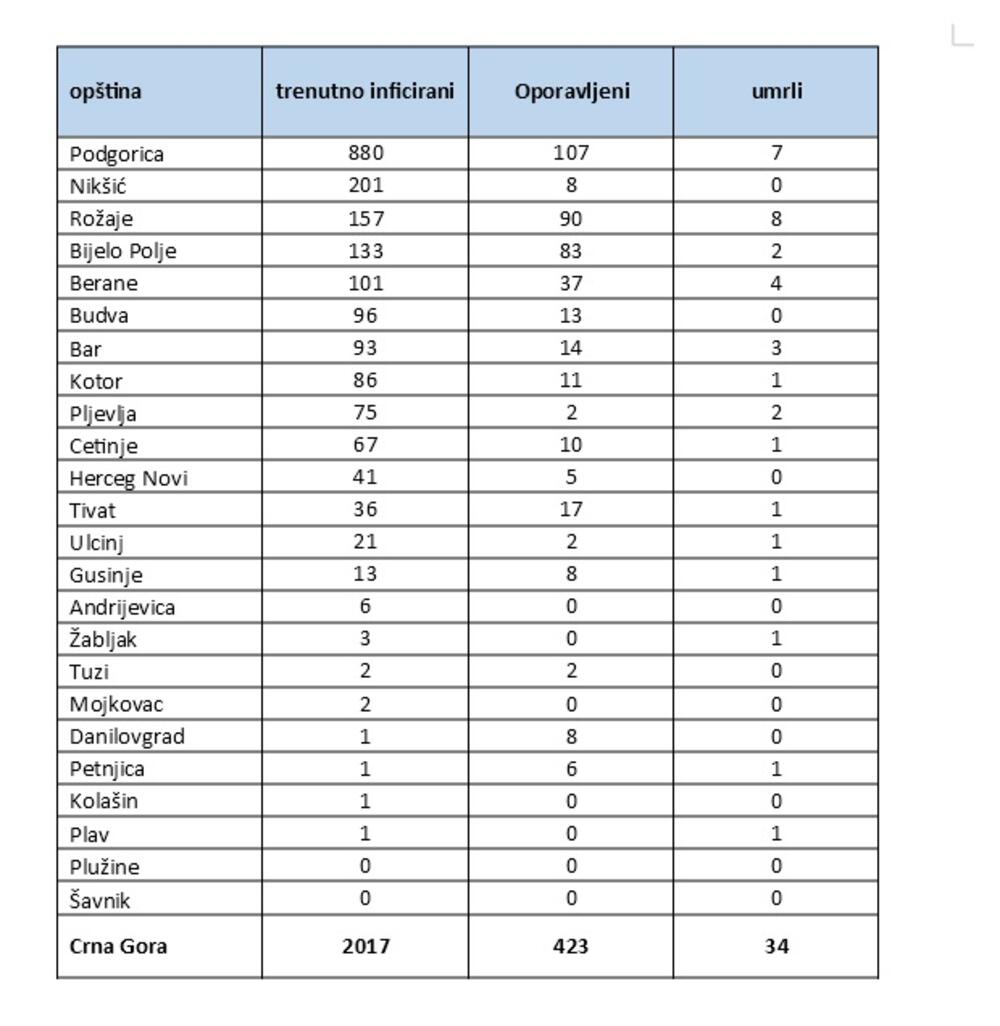 Novozaraženi su sa teritorije sljedećih opština: