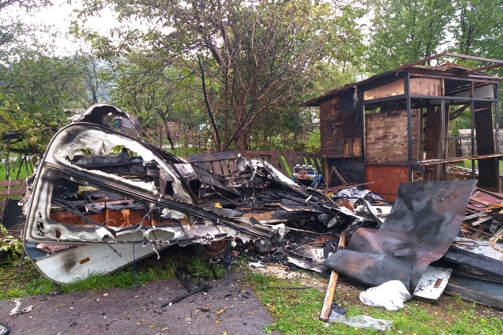 Kamp prikolica u kojoj je živjela Nikšićanka Slavka Adžović i njena sestra Nada izgorjela je noćas u požaru. Adžovići, koji žive u naselju pod Trebjesom, sumnjaju da je prikolicu neko namjerno zapalio i nadaju se da će policija naći počinioca jer, kako reče Slavka, suviše često im se dešavaju požari, a niko još nije uhapšen.