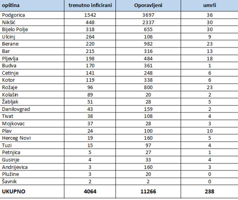 Uzimajući u obzir sve novootkrivene slučajeve kao i broj oporavljenih u protekla 24 časa, ukupan broj trenutno aktivnih slučajeva COVID19 u Crnoj Gori iznosi 4.064.