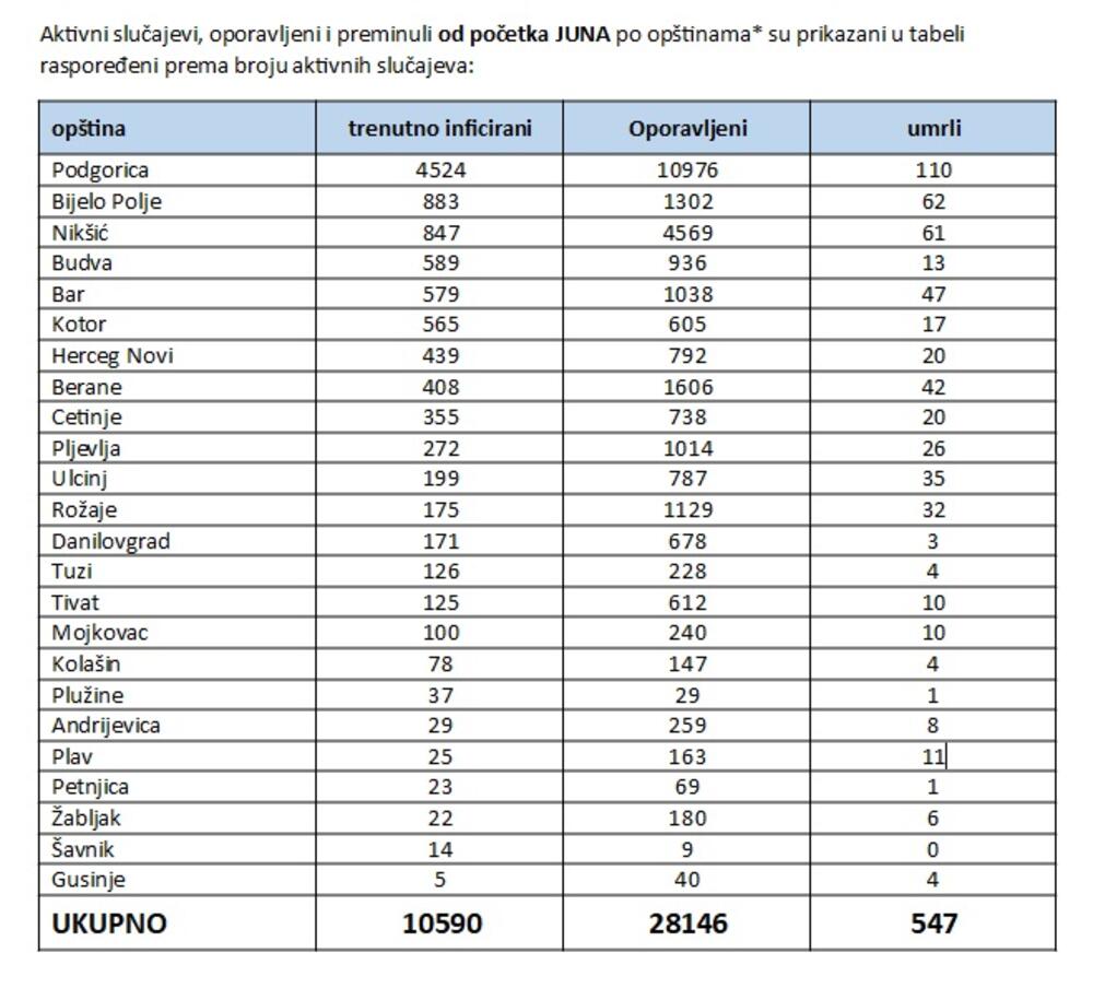 U Crnoj Gori je od početka epidemije preminulo 556, a od početka juna 547 oboljelih od Kovida-19. Od početka godine registrovano je 39.607 slučajeva infekcije koronavirusom.