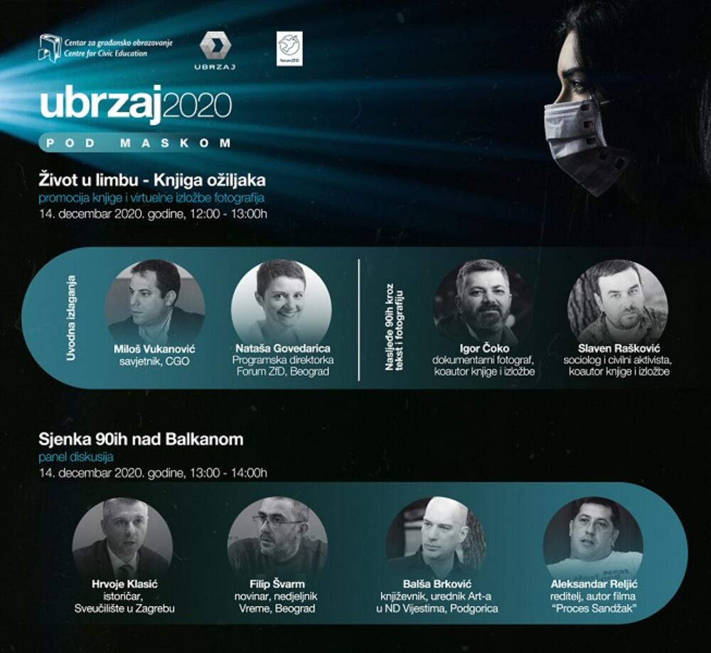 Iz CGO su kazali da takođe, posljednjeg dana Festivala UBRZAJ u okviru pratećeg programa koji se odnosi na suočavanje sa prošlošću organizuje se promocija knjige i virtuelne izložbe fotografija "Život u limbu – knjiga ožiljaka" o kojoj će govoriti njeni autori Igor Čoko i Slaven Rašković od 12-13 časova, a nakon toga slijedi panel diskusija "Sjenka 90ih nad Balkanom" u okviru koje govore Hrvoje Klasić, istoričar iz Zagreba, Filip Švarm, novinar iz Beograda, Balša Brković, književnik iz Podgorice i Aleksandar Reljić, novinar i reditelj iz Novog Sada.