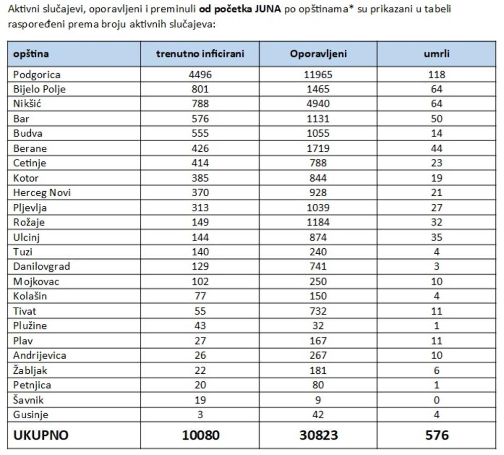 Najviše novih slučajeva zabilježeno je u Podgorici, njih 148. Slijede Nikšić (87), Bar (24), Cetinje (23), Berane (22), Budva (17), Pljevlja (15), Bijelo Polje i Rožaje (11), Herceg Novi (7), Tuzi (3). Po dva slučaja registrovana su u Kotoru i Andrijevici, a po jedan u Ulcinju, Šavniku, Petnjici, Mojkovcu i Žabljaku.