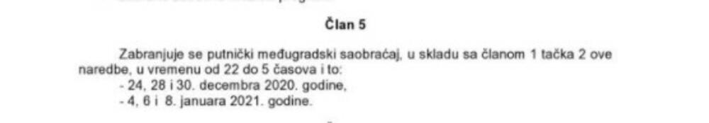 Međugradski saobraćaj je, kako je navedeno u Službenom listu Crne Gore zabranjen 24, 28. i 30. decembra, te 4, 6. i 8. januara u vremenu od 22 do 5 časova ujutru.